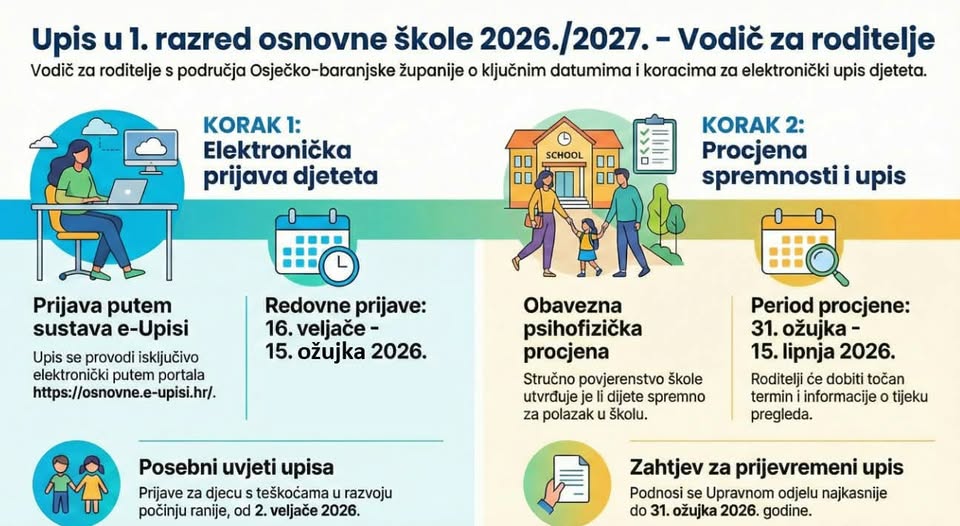 16. veljače 2026. u Nacionalnom informacijskom sustavu za upise u osnovne škole otvaraju se prijave za redovan upis u prvi razred osnovne škole.