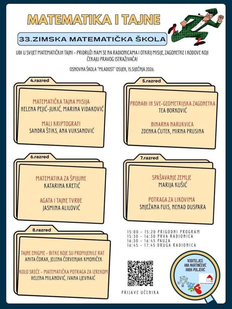 U organizaciji OŠ “Mladost” Osijek, Fakulteta primjenjene matematike i informatike Osijek, Udruge matematičara Osijek i Agencije za odgoj i obrazovanje, 15. siječnja 2026. godine u OŠ “Mladost” Osijek održana je 33. Zimska matematička škola za učenike osnovnih škola. Tema ovogodišnje zimske škole bila je Matematika i tajne. Naši učenici Petar Brandis, Borna Mićan, Petra Smješka i Eva Meznarić u pratnji svoje učiteljice Marice Vavra sudjelovali su u Zimskoj matematičkoj školi, te ušli u svijet matematičkih tajni. Sudjelovali su na radionicama: Pronađi ih sve – geometrijska zagonetka, Binarna narukvica, Tajna enigme – bitke koje su promijenile rat i Kolo sreće – matematička potraga za izrekom. Učenici su s radionica izašli sretni i zadovoljni. Učenice osmih razreda žale jer iduće godine neće ići, a učenici petih razreda nadaju se sudjelovanju i iduće godine.